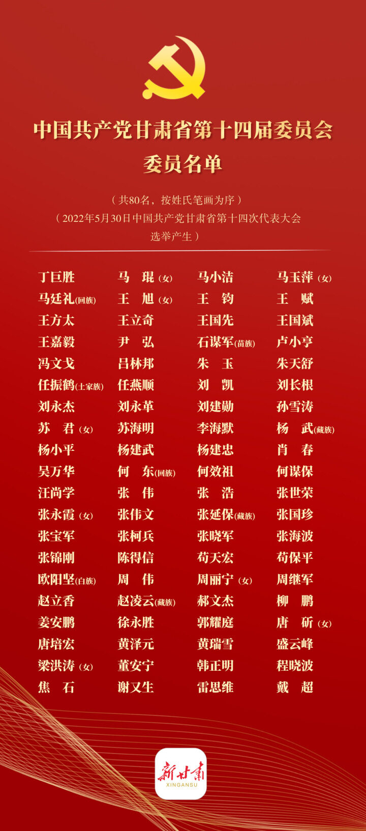 中國(guó)共產(chǎn)黨甘肅省第十四屆委員會(huì)委員名單