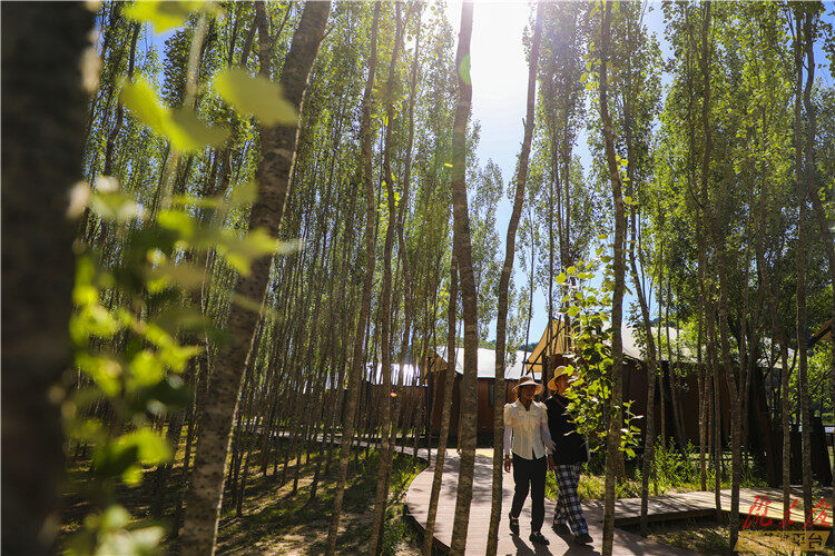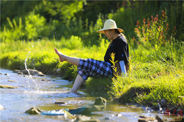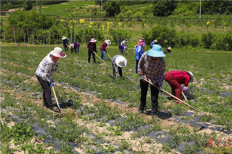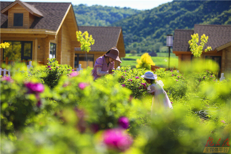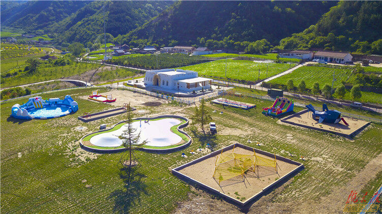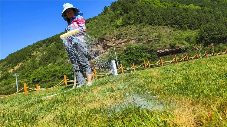 ↑6月16日,在合水縣花溪谷生態(tài)旅游景區(qū),工人們給新栽植的花卉和綠化樹木除草、澆水,各項基礎設施及配套設施建設進入收尾階段。