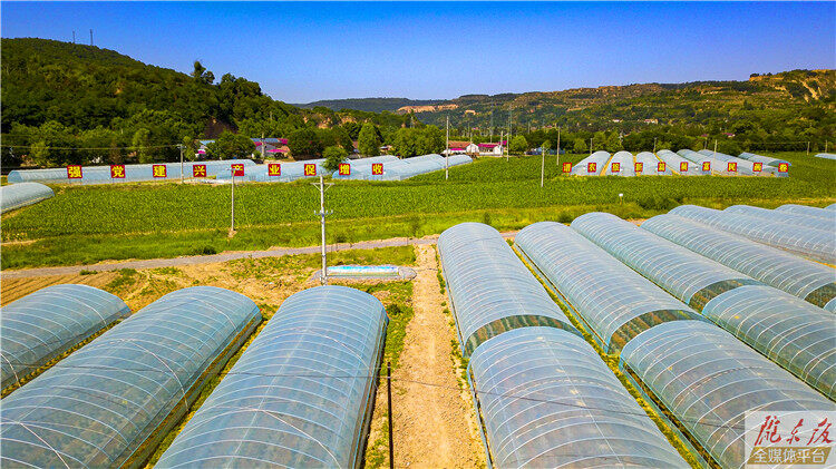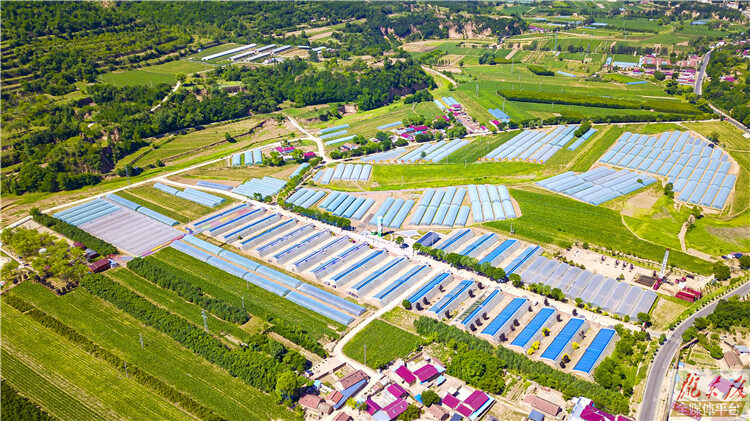 ↑6月15日,俯瞰合水縣固城川設施瓜菜生產(chǎn)基地,棗樹園田園綜合體位于其中。