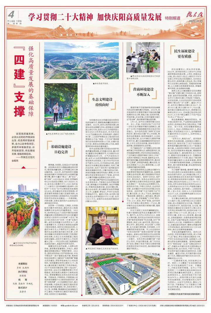 一江潮涌海天闊,慶陽發(fā)展正當(dāng)時(shí)。黨的二十大擘畫了未來發(fā)展的藍(lán)圖,為今后發(fā)展指明了方向。不懈奮斗,才能實(shí)現(xiàn)新的輝煌。全市上下將把黨的二十大精神創(chuàng)造性地落實(shí)在慶陽老區(qū)高質(zhì)量發(fā)展的成效上、政治生態(tài)持續(xù)優(yōu)化上、各級(jí)領(lǐng)導(dǎo)班子和干部擔(dān)當(dāng)作為上,按照市第五次黨代會(huì)確定的發(fā)展思路,切實(shí)增強(qiáng)慶陽大有可為的信心、大有作為的擔(dān)當(dāng)、事在人為的干勁,不斷激發(fā)廣大干部群眾干事創(chuàng)業(yè)的熱情,奮力推動(dòng)各項(xiàng)工作取得新進(jìn)展新成效。