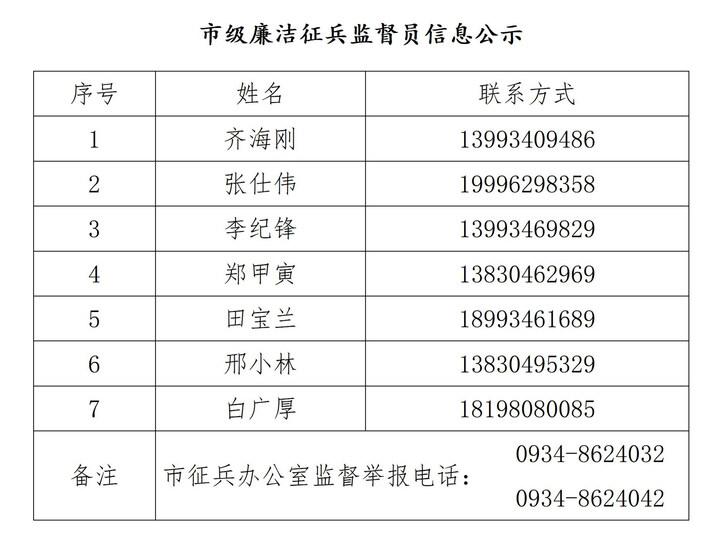 現(xiàn)將市級廉潔征兵監(jiān)督員和市縣兩級廉潔征兵監(jiān)督舉報電話、信箱進行公示,接受應(yīng)征青年和家長反映違反征兵紀律規(guī)定現(xiàn)象。