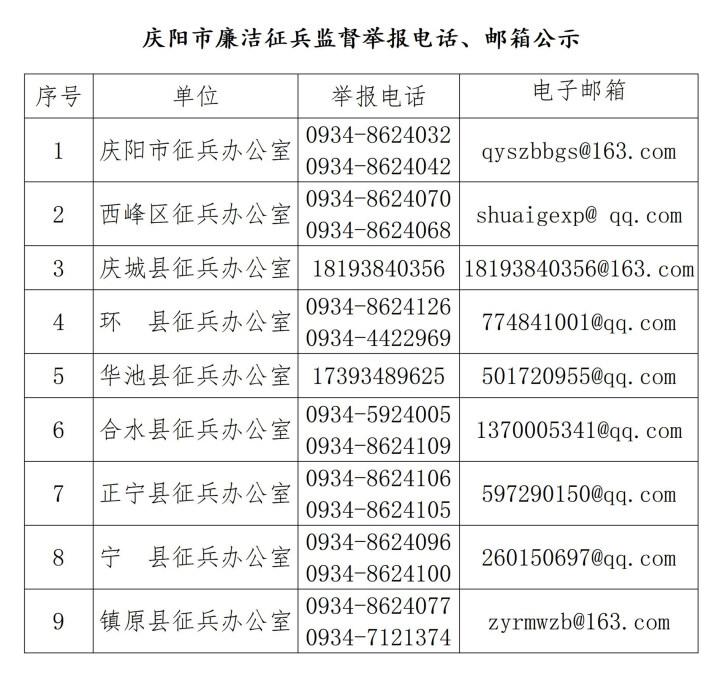 慶陽市廉潔征兵監(jiān)督舉報電話、郵箱