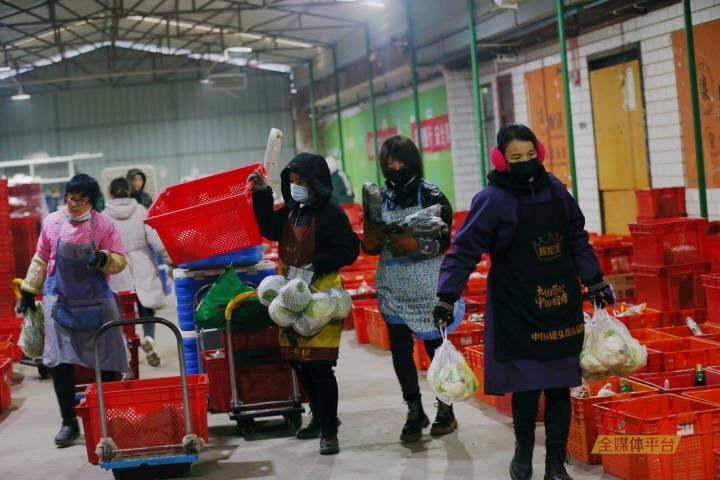 8時,后官寨鎮(zhèn)公共服務(wù)站的工作人員正在分揀果蔬生鮮。隴東報全媒體記者 趙彩霞 攝
