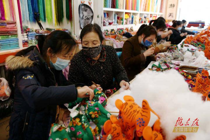 13時,慶陽岐黃文化傳播有限公司的繡娘正在制作文創(chuàng)老虎香包。隴東報全媒體記者 趙彩霞 攝