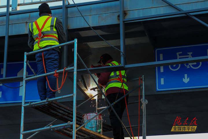 19時,工人在育才路天橋下安裝信號燈。隴東報全媒體記者 陳飛 攝