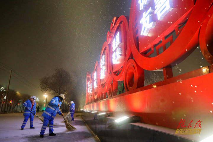 4時,環(huán)衛(wèi)工人在和諧廣場東側(cè)清掃人行道積雪。隴東報全媒體記者 俄少飛 攝