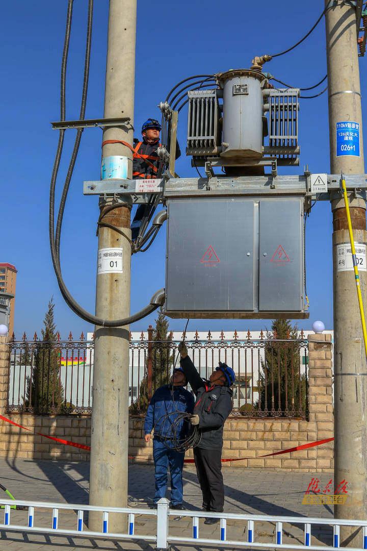 15時,電力工人在檢查線路故障。隴東報全媒體記者 陳飛 攝