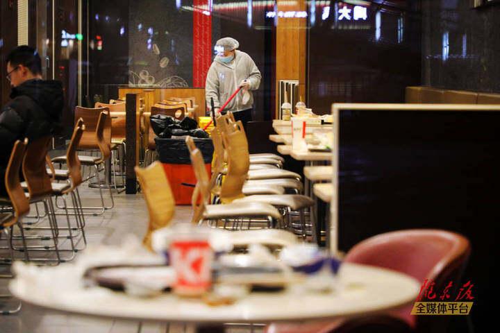 23時,一家快餐店的工作人員在打掃店內(nèi)衛(wèi)生。隴東報全媒體記者 俄少飛 攝