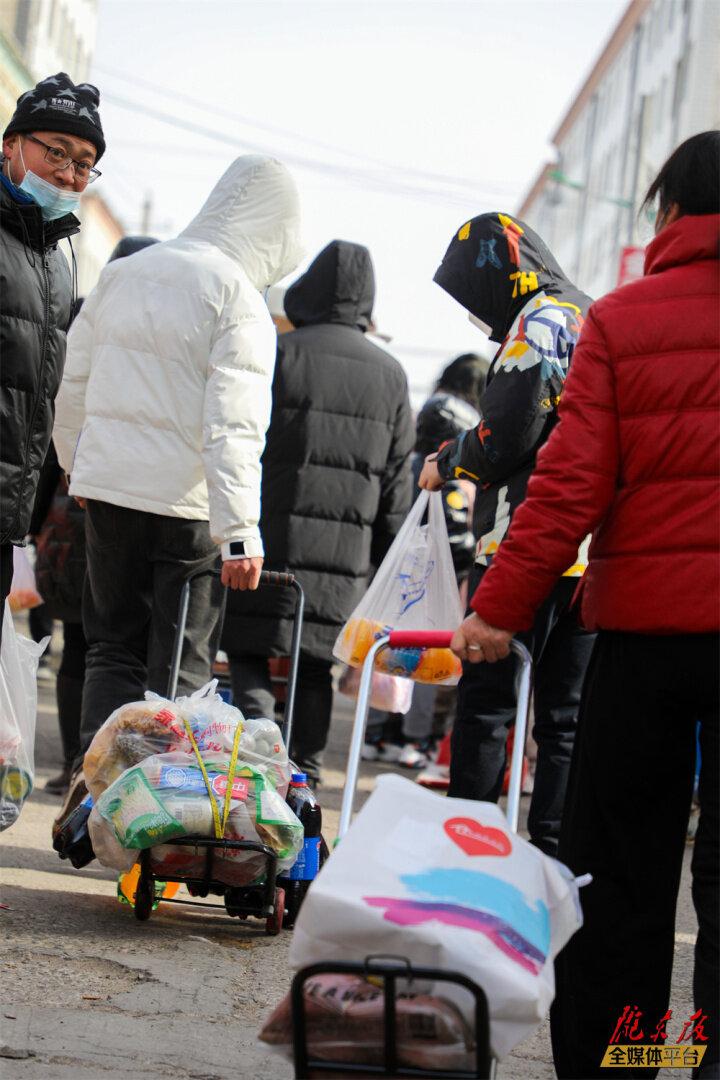 人們用小推車運輸購買的年貨。