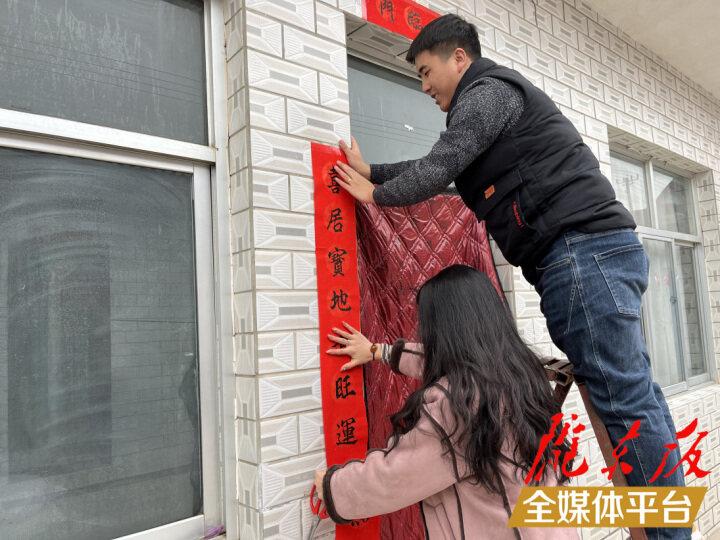 張攀鋒和妻子一起貼對聯(lián)。