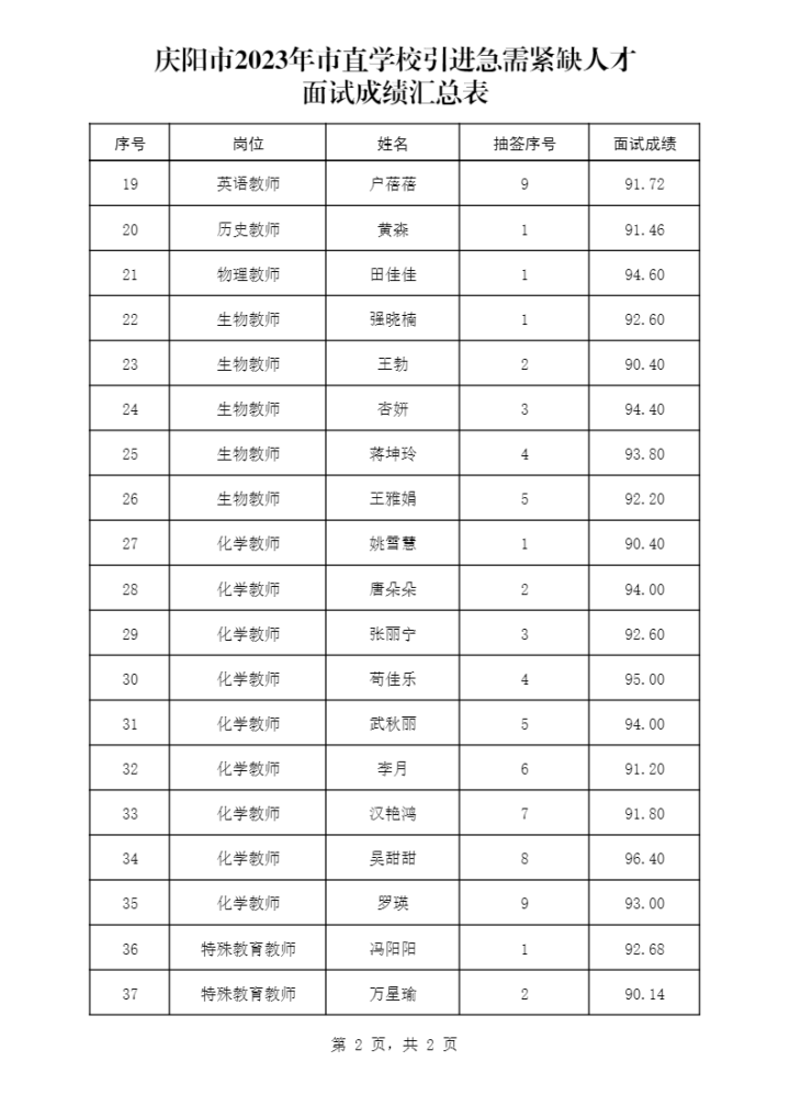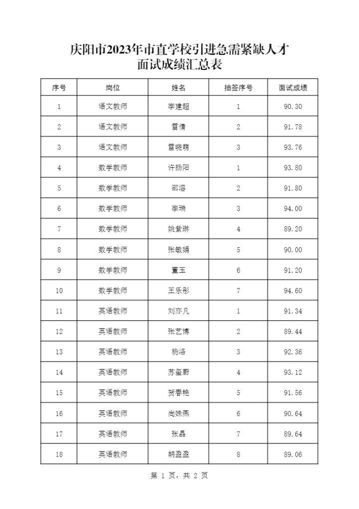 附件:慶陽市2023年市直學(xué)校引進急需緊缺人才面試成績