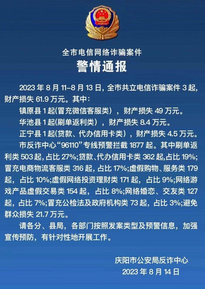 財產損失61.9萬元!慶陽公安發(fā)布8月11——8月13日電信詐騙案件警情通報