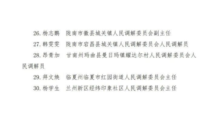 根據(jù)《司法部辦公廳關(guān)于開展全國模范人民調(diào)解委員會全國模范人民調(diào)解員評選表彰工作的通知》(司明電〔2023〕31號)要求,甘肅省司法廳按照評選條件和推薦程序,在全省范圍組織開展了評選推薦工作。各級司法行政機關(guān)堅持公開公平公正原則,采取自下而上、逐級評選推薦的方式,在征求當?shù)亟M織人事、紀檢監(jiān)察、公安機關(guān)等部門意見的基礎(chǔ)上,經(jīng)縣(市、區(qū))司法局初選、市(州)司法局推薦、省司法廳黨委會議研究,擬向司法部推薦9個“全國模范人民調(diào)解委員會”和30名“全國模范人民調(diào)解員”(名單、事跡簡介附后)。