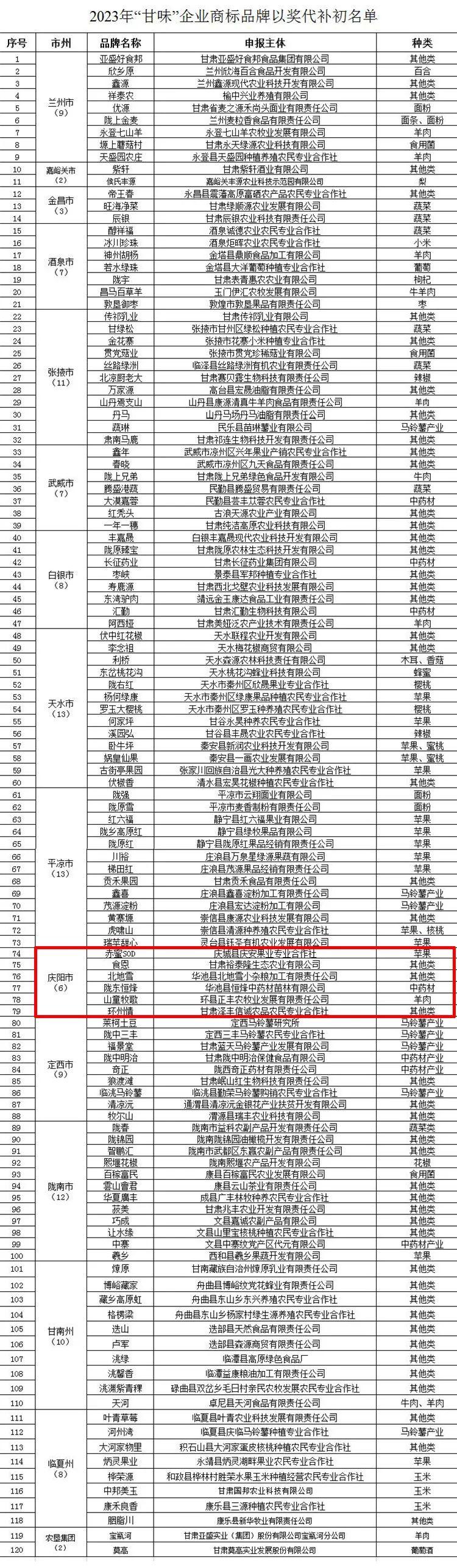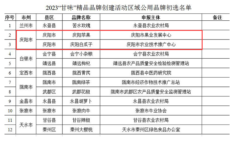 在各地品牌主體自主申報、市縣農(nóng)業(yè)農(nóng)村部門審核推薦的基礎(chǔ)上,經(jīng)形式性審查,初選產(chǎn)生了12個“甘味”區(qū)域公用品牌和120個“甘味”企業(yè)商標(biāo)品牌,現(xiàn)予以公布。