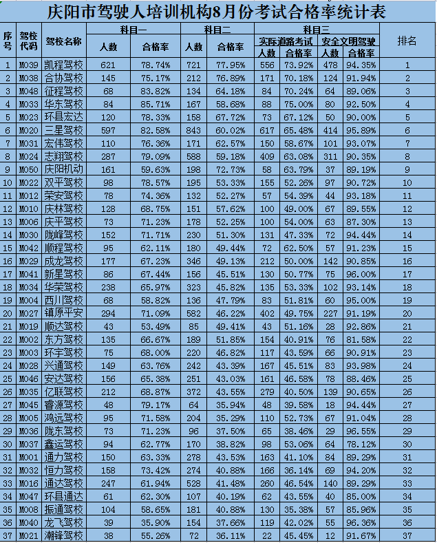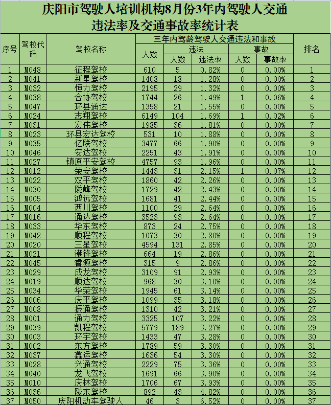 為加強(qiáng)全市交通安全管理工作,營造良好交通秩序環(huán)境,確保市民出行安全、暢通,我市加大力度打擊培訓(xùn)質(zhì)量存在問題的駕校和各類交通違法行為。按照《機(jī)動車駕駛證申領(lǐng)和使用規(guī)定》的要求,根據(jù)省公安廳交管局預(yù)防道路交通事故“減量控大”工作要求,慶陽市公安局交警支隊(duì)車輛管理所現(xiàn)向社會公布8月份本市各駕培機(jī)構(gòu)培訓(xùn)質(zhì)量、三年內(nèi)駕齡駕駛?cè)私煌ㄟ`法率、交通事故率等信息,以進(jìn)一步加強(qiáng)駕駛?cè)伺嘤?xùn)考試的監(jiān)管力度,切實(shí)提高各駕駛培訓(xùn)機(jī)構(gòu)的培訓(xùn)能力和質(zhì)量,為廣大群眾學(xué)習(xí)駕駛提供更直觀的選擇參考,促進(jìn)駕駛?cè)伺嘤?xùn)考試工作健康、有序發(fā)展。