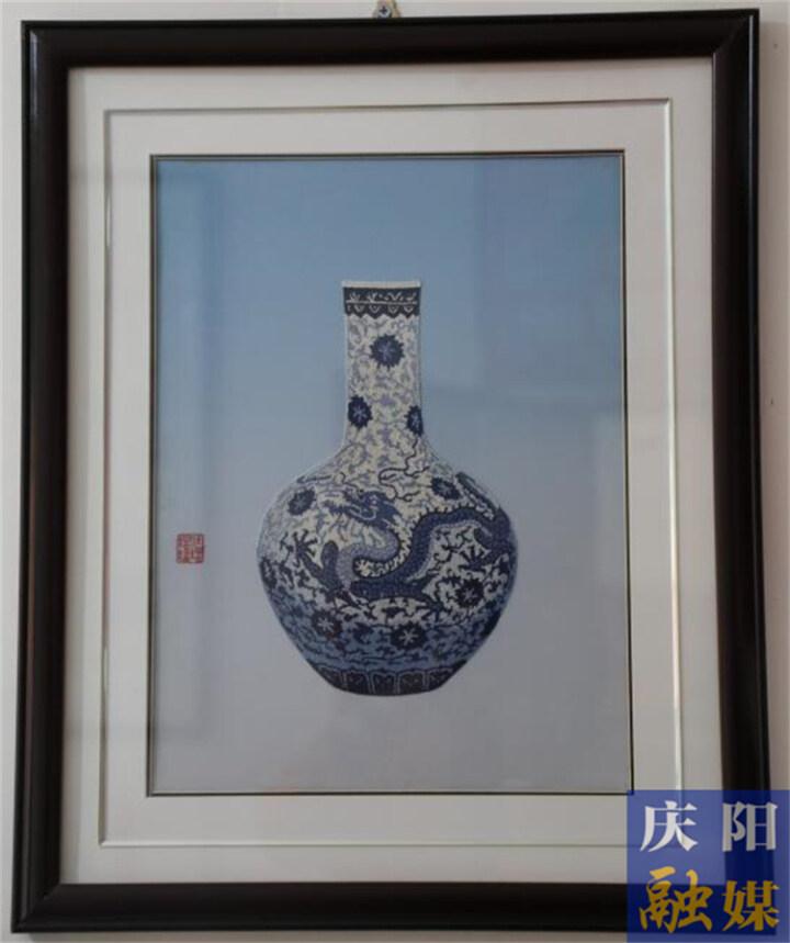 在展柜上,一組青花瓷的刺繡作品格外引人注目,色度不同的藍(lán)色繡線,在任艷艷的手中變幻出深淺變化的色彩搭配,再加上傳統(tǒng)打籽繡針法的運(yùn)用,一針打一個(gè)結(jié),與平面繡相比,表面呈現(xiàn)出的立體感增強(qiáng),也賦予了這組青花瓷作品別樣的表達(dá)。