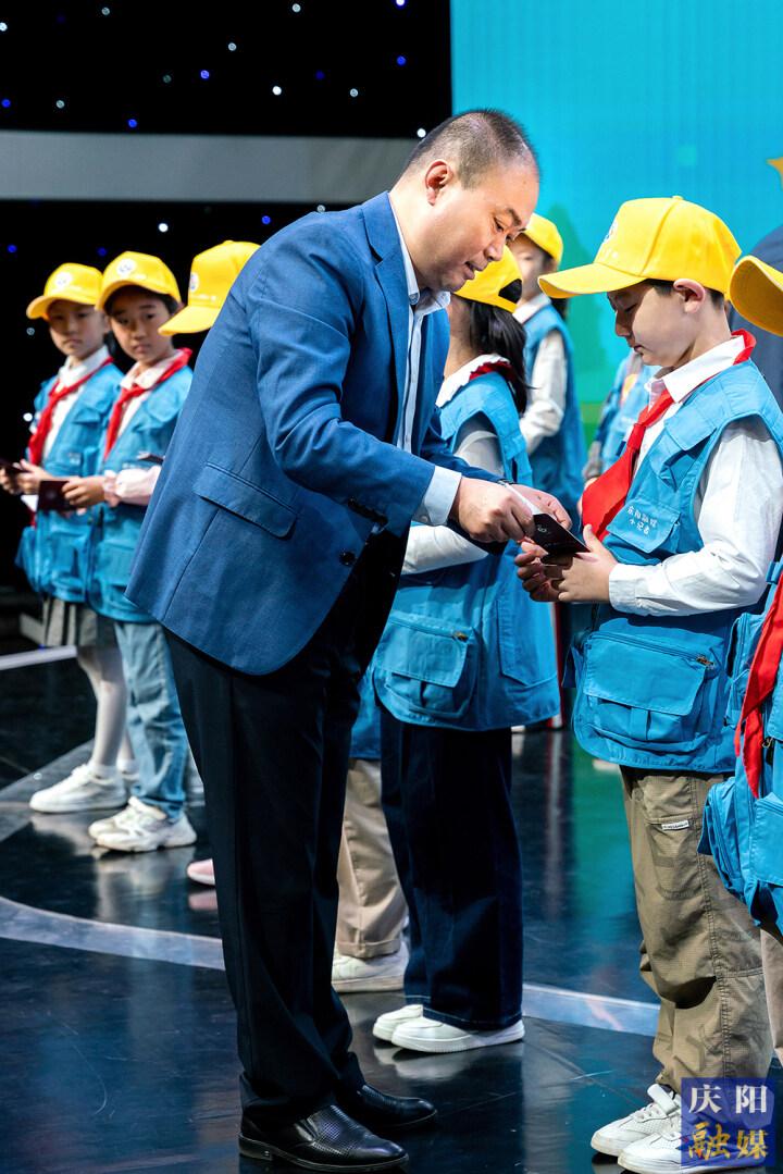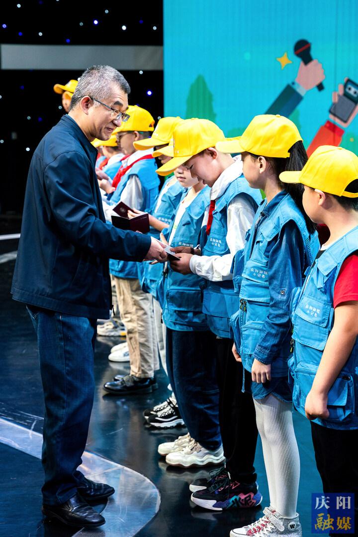 慶陽市融媒體中心黨組書記、主任先朝陽為小記者發(fā)放“記者證”。