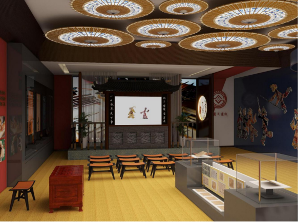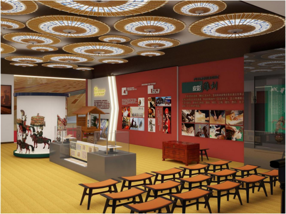 展廳入口采用杜邦紙透光影效簡介環(huán)縣皮影,門楣設(shè)八米環(huán)縣長卷,壯麗鄉(xiāng)情一覽無余,立體發(fā)光大字“環(huán)縣·中國皮影之鄉(xiāng)”。展廳正中心設(shè)計動力旋轉(zhuǎn)裝置展示《帝王出巡》皮影作品。展廳正面設(shè)計有皮影演藝臺,四十多家道情皮影班組等待為參展人員一展絕藝。展廳兩個側(cè)面設(shè)計立體造型墻,宣傳非遺之美、環(huán)縣皮影之美。展廳天花為傘形燈光覆蓋,傘面有絕美環(huán)縣詩章散發(fā)濃厚人文氣息。皮影制作展區(qū)設(shè)置于展廳左中。