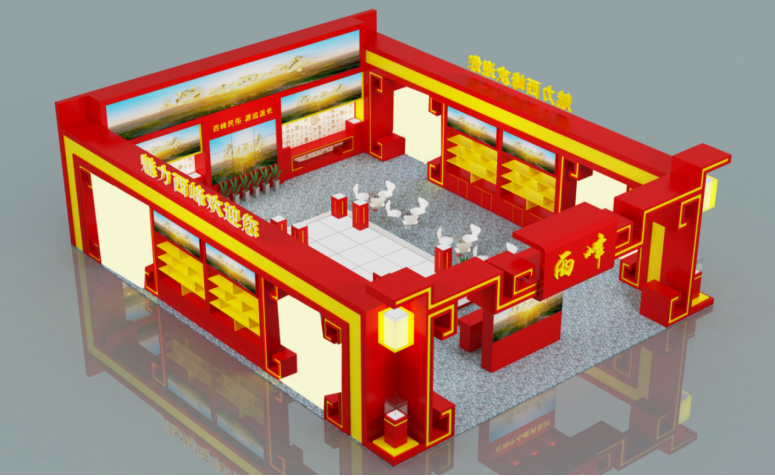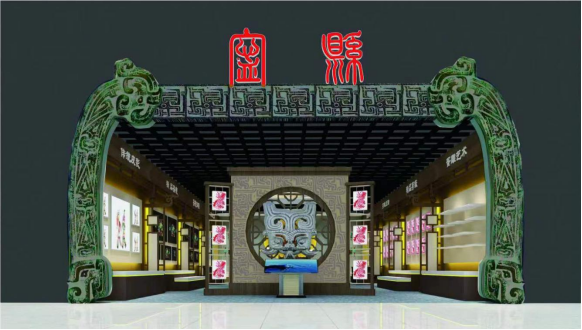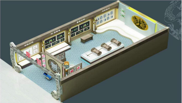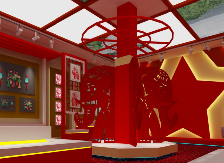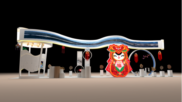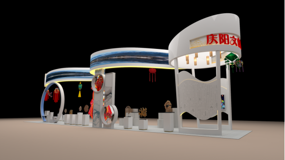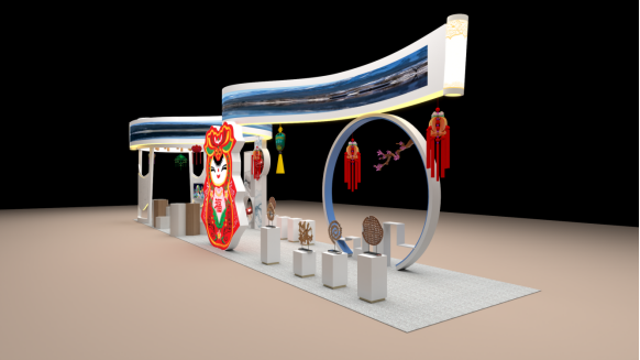 展廳入口設(shè)計鏤空立體雕刻兩個吉“象”門迎,門頭上面設(shè)計曲面波動造型及交織飄帶造型,立體發(fā)光大字“合水”。展廳正中心設(shè)計傳統(tǒng)兩組大象立體造型,用于懸掛各類民俗產(chǎn)品等,中間位置設(shè)置多層展臺擺放面塑等作品。展廳正面設(shè)計立體規(guī)則的多層五角星輪廓、四周設(shè)計燈帶,作為中心展臺展位,便于擺放、懸掛民俗文化展品。突出展示合水面塑、香包、根雕、刺繡等。展廳兩個側(cè)面設(shè)計鏤空立體雕刻6組,用于懸掛刺繡剪紙等作品,虛實(shí)結(jié)合,下面設(shè)計展臺,突出展示合水其他大小件擺件等。展廳頂子設(shè)計不同的拉布燈箱及角花,采用圖案以合水五張名片為主。