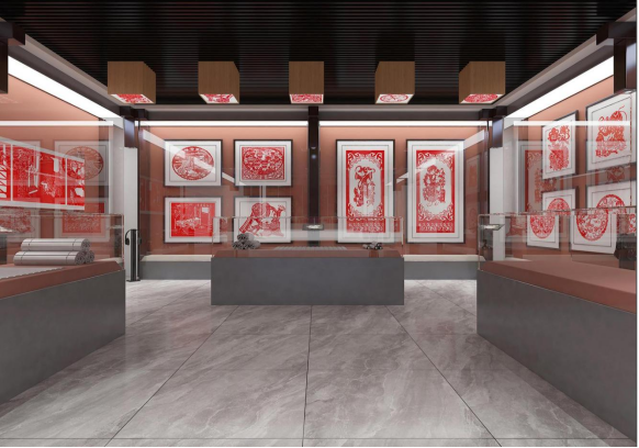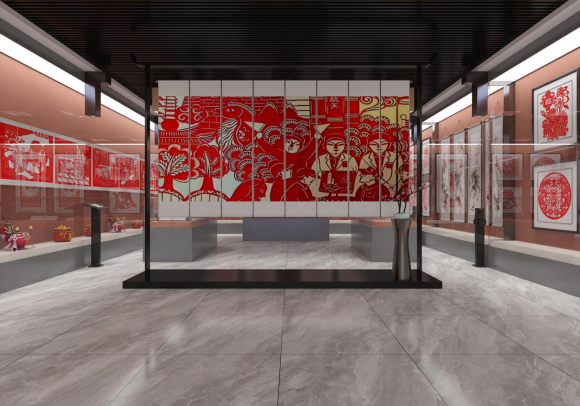 東、南、北三墻面布置版塊一剪紙作品,南北兩側(cè)靠墻設(shè)置展臺若干,展示版塊二、三、四作品。