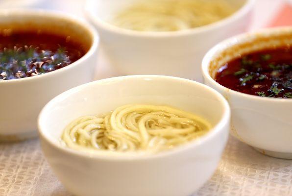 慶陽饸饹面講究細(xì)而長、柔而韌,湯清而辣,辣中含清香之感,饸饹面也可素調(diào)干拌食用。桌上,鹽、醋、油潑辣子等調(diào)味一應(yīng)俱全,腌韭菜、腌辣椒、拌蘿卜絲、拌豆芽、拌黃瓜等小菜擺得賞心悅目。一碗面到手,要吸溜著吃完才算心滿意足。
