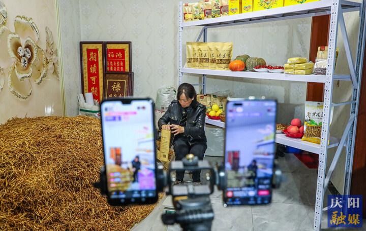 鎮(zhèn)原縣廟渠鎮(zhèn)文夏村村民通過(guò)網(wǎng)絡(luò)直播售賣(mài)自家農(nóng)產(chǎn)品。
