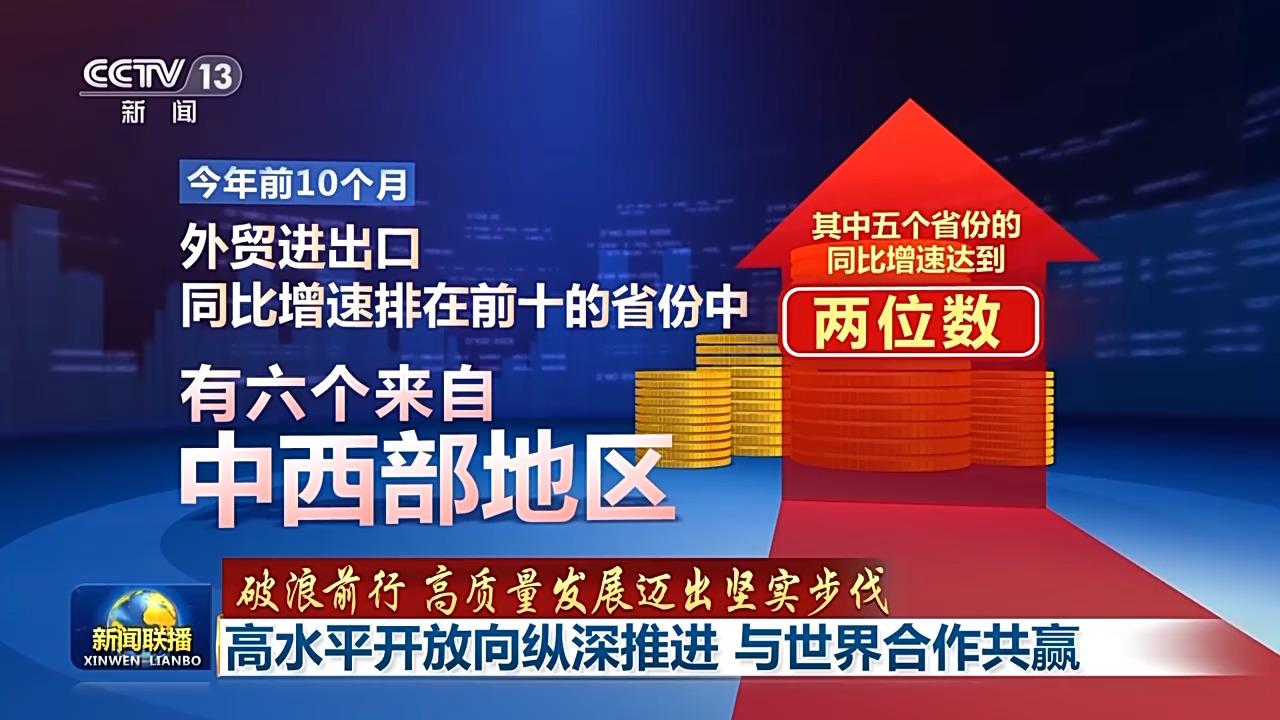 高水平開(kāi)放,也讓曾經(jīng)的開(kāi)放“末梢”變成“前沿”。最新數(shù)據(jù)顯示,今年前10個(gè)月,外貿(mào)進(jìn)出口同比增速排在前十的省份中,有六個(gè)來(lái)自中西部地區(qū)。其中五個(gè)省份的同比增速達(dá)到兩位數(shù)。