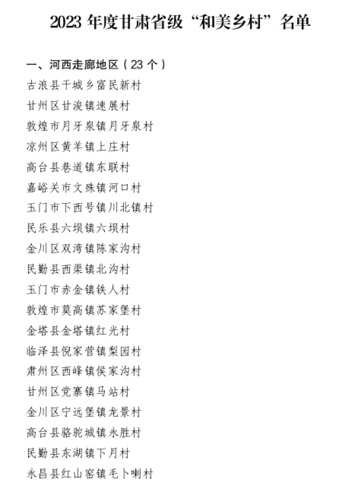 按照省委辦公廳、省政府辦公廳《甘肅省“和美鄉(xiāng)村”創(chuàng)建行動實(shí)施方案》和省委農(nóng)辦《甘肅省“和美鄉(xiāng)村”示范創(chuàng)建標(biāo)準(zhǔn)(2023—2025年)》《甘肅省“和美鄉(xiāng)村”評審認(rèn)定實(shí)施辦法(試行)》等文件精神,在全省14個市州和蘭州新區(qū)自愿申報的基礎(chǔ)上,組織評審答辯,擬認(rèn)定古浪縣干城鄉(xiāng)富民新村等94個行政村為2023年度甘肅省省級“和美鄉(xiāng)村”,現(xiàn)將名單進(jìn)行公示,聽取社會意見,接受社會監(jiān)督。