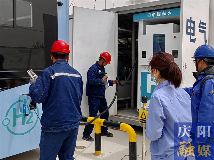 ▲永慶天然氣集團(tuán)工作人員為氫能源公交車加氫。