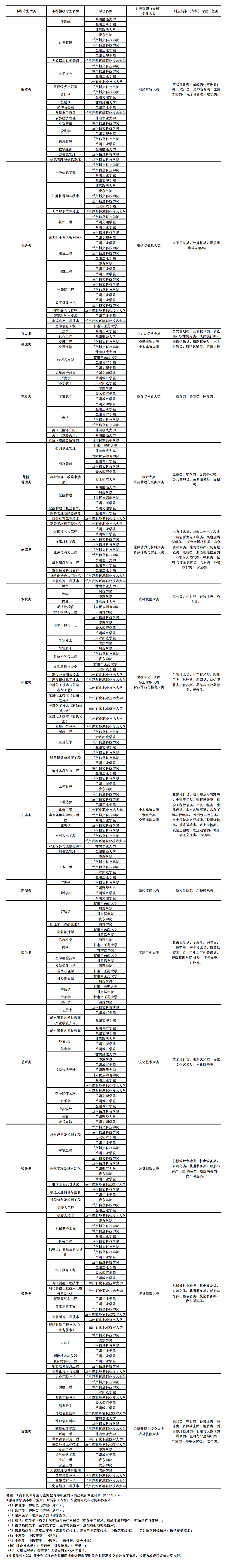 2.2024年甘肅省普通專升本高職(??疲┖捅究茖I(yè)大類對照表以及招生學(xué)校及專業(yè)目錄