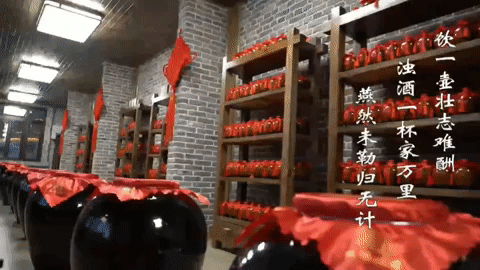 一排排紅布遮罩的酒缸散發(fā)著陣陣酒香