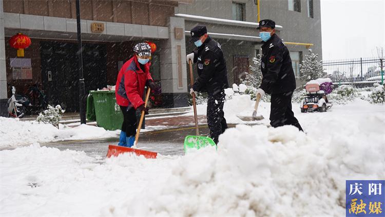 西峰城區(qū)某小區(qū)物業(yè)工作人員清理積雪。