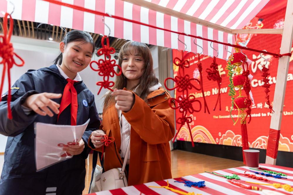 1月28日,復旦大學第二附屬學校學生(左)為馬斯卡廷學生(右)介紹中國結(jié)。