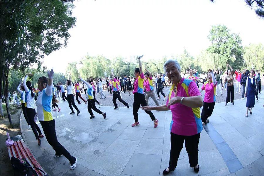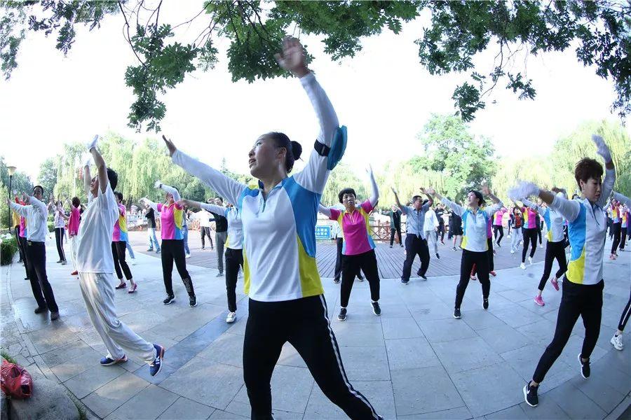 人們跳著廣場(chǎng)舞,練太極劍。