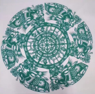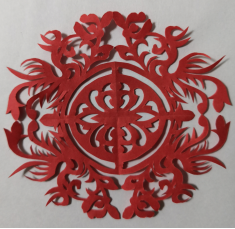 七千萬年前,環(huán)江翼龍扇動著兩米多寬的翅膀,滑翔在黃土高原鄂爾多斯盆地之上,那是晚侏羅紀時代,這個時代開始于2.5億年前,結束于6500萬年前。翼龍化石1978年5月發(fā)掘于慶陽市慶城縣三十里鋪鄉(xiāng)之環(huán)江東岸,那是我國發(fā)現(xiàn)的最早的個體最大的翼手龍類翼龍,環(huán)江翼龍與黃河象是最能代表隴東地域文化的遠古動物化石,乃慶陽的文化地標。郭金芳以之為題材,進行剪紙藝術的再創(chuàng)作,運用的是團花式的循環(huán)結構,依然以石榴、牡丹裝飾,以日月紋形成在宇宙飛翔的動勢。