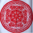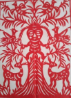 姚秀英、梁秋梅的剪紙讓我特別注意。一個有豐厚淳純的民間味——姚之第一幅,似是一對跳舞的人兒;一個有新的現(xiàn)代的創(chuàng)意——梁的剪紙上那顆燭光高照的心里生出的娃娃,便是美好愛情的結晶。她們的作品頗可深入了解。在民藝的研究中,說是發(fā)現(xiàn),其實就是發(fā)現(xiàn)者先前是盲目的,自己沒有深入罷了。發(fā)現(xiàn)民藝,尋找獨特,探知思維,感受心靈,方能欣賞剪紙藝術里濃郁的審美情懷。而趙白玲就更是一位天才的民間剪紙大家了,她的剪紙完全呈現(xiàn)出傳統(tǒng)剪紙無限的創(chuàng)造活力,脫俗,奔放自由,進入忘我的快樂的自在世界。文彩彩的剪紙又將虔誠的祈禱與信仰滲透在萬般的祝福里,達到了異常飽滿的令人震撼的境界。張改琴剪紙藝術的復活也就是她的人生老來精神的再一次復原、再生——用她自己的話說,就是她以剪紙“再活一世人”。