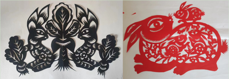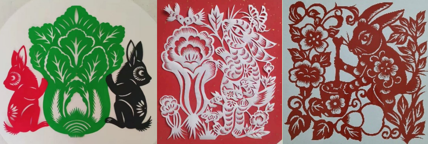 慶陽剪紙藝術隊伍能夠傳承與創(chuàng)作并重,一專多能。許多剪紙藝術家已經成為代表慶陽文化的形象大使。剪紙創(chuàng)作、學術研究、活動組織三方面人力、人才密切配合,構成了一個積極向上的民俗傳承、技藝傳承、教育傳承、學術傳承“四結合”的團隊。在慶陽鄉(xiāng)村振興、城鎮(zhèn)文化發(fā)展、對外交流、全國培訓、剪紙教學等方面人才分布合理,呈現(xiàn)出星羅棋布的布局。最關鍵的是,慶陽剪紙在把握共性風格的同時,追求個性的特點。我以一組兔子題材的小品說明這個優(yōu)點。比如張雪峰、張銳利、馬路、曹永琴等,就是慶陽市杰出的綜合性很強的民間藝術人才。