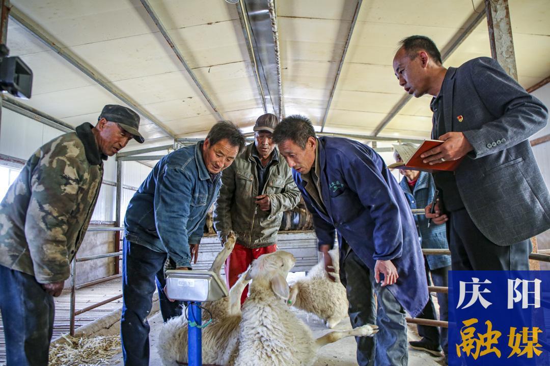 ▲環(huán)縣洪德鎮(zhèn)大戶(hù)塬村羔羊育肥場(chǎng)養(yǎng)殖戶(hù)正在與工作人員進(jìn)行過(guò)磅交售。慶陽(yáng)融媒記者 曹拯 攝。