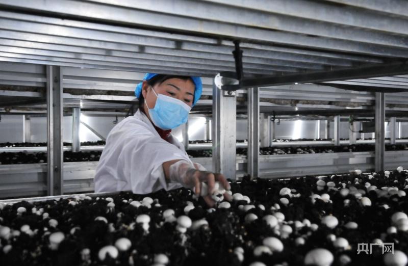 工人正在甘農(nóng)蘑力食用菌全產(chǎn)業(yè)鏈雙孢菇標(biāo)準(zhǔn)化生產(chǎn)基地采摘雙孢菇(央廣網(wǎng)記者 李紅軍 攝)