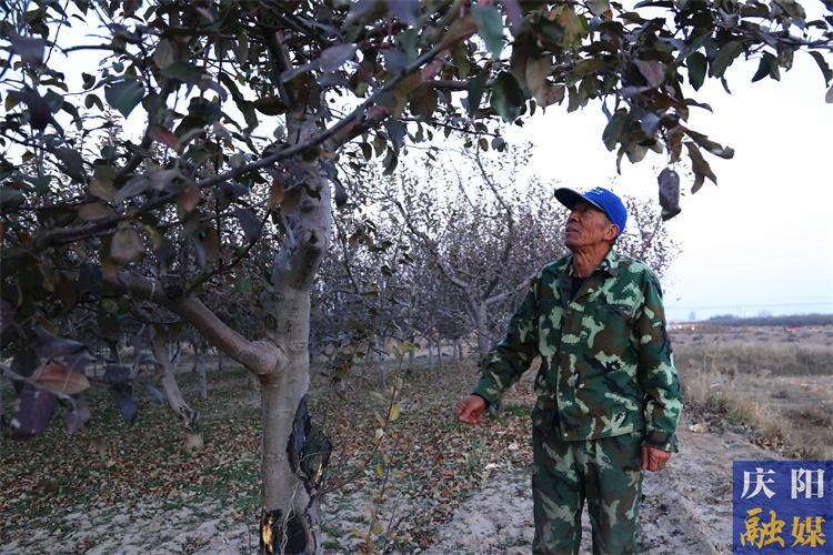 ▲慶城縣驛馬鎮(zhèn)太樂村村民王育祥查看果樹生長情況。