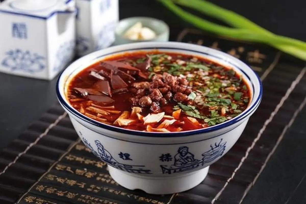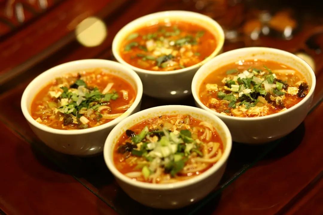 湯分為葷湯和清湯兩種,葷湯加臊子,清湯不加。清湯的做法:將白蘿卜、紅蘿卜、豆腐、土豆、番瓜、黃花菜、少許木耳切丁,其中白蘿卜丁、紅蘿卜丁用開水提前掠熟。炒制過程中加入大量辣椒面、胡椒粉、少許花椒粉、鹽,加水成湯??谖镀匾稽c(diǎn)好。