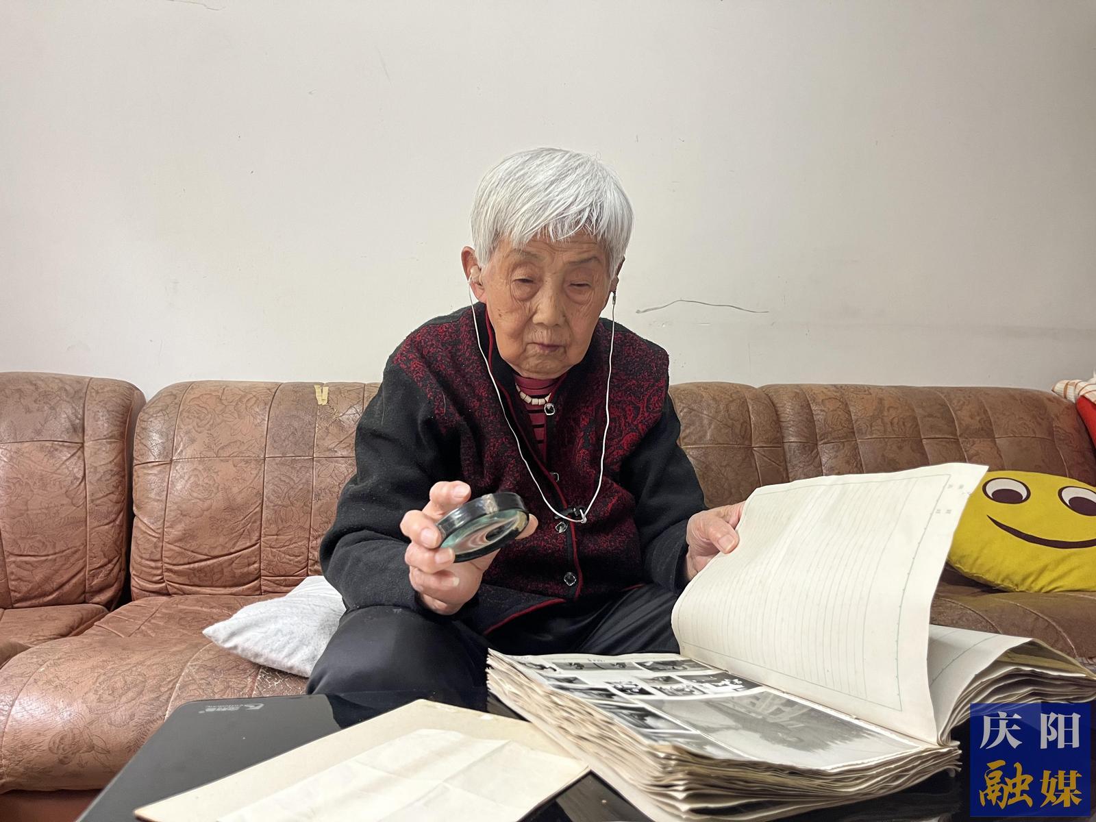 龐素霞翻閱年輕時(shí)工作記錄。