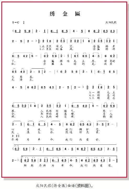 《繡金匾》這首膾炙人口的經(jīng)典紅色歌曲,是20世紀(jì)30年代從隴東革命根據(jù)地新正縣(今正寧縣)土生土長的民間藝術(shù)之花,是從隴東唱響全國的革命歌曲。這首歌是以隴東民間小調(diào)《繡荷包》為基礎(chǔ)改編的,抒發(fā)了廣大人民群眾對毛澤東、朱德、周恩來等中共領(lǐng)導(dǎo)人的熱愛以及對人民子弟兵——八路軍的深厚情誼,在中國民歌藝術(shù)殿堂里綻放著璀璨光芒。
