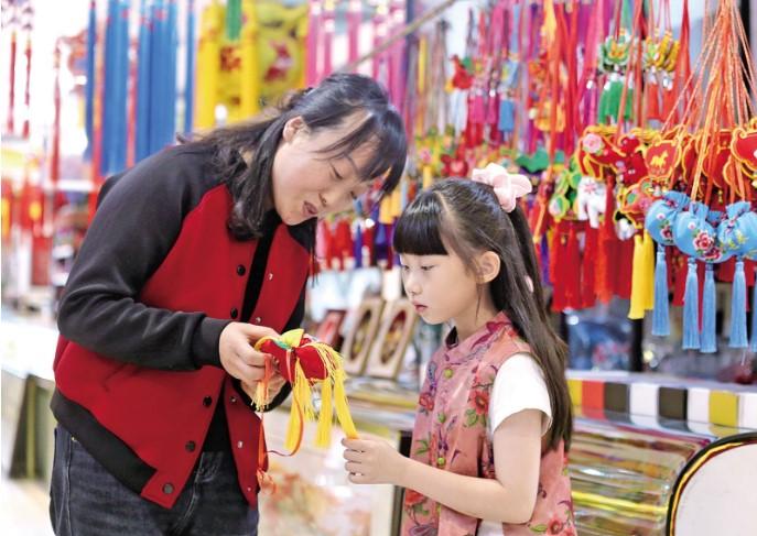 筆者來(lái)到西峰區(qū)廣場(chǎng)路香包售賣攤點(diǎn)看到,用五彩絲線手工編織的花繩一簇簇懸掛著,一個(gè)懸掛著各式繡球的“粽子”香包顯得十分喜慶,蘊(yùn)含龍?jiān)氐南惆a(chǎn)品很受顧客青睞?!拔液芟矚g這款‘小福龍’香包掛件,感覺(jué)今年的香包比往年更精致,我準(zhǔn)備買一些送給外地的親戚朋友?!笔忻駨埿?qiáng)說(shuō)。