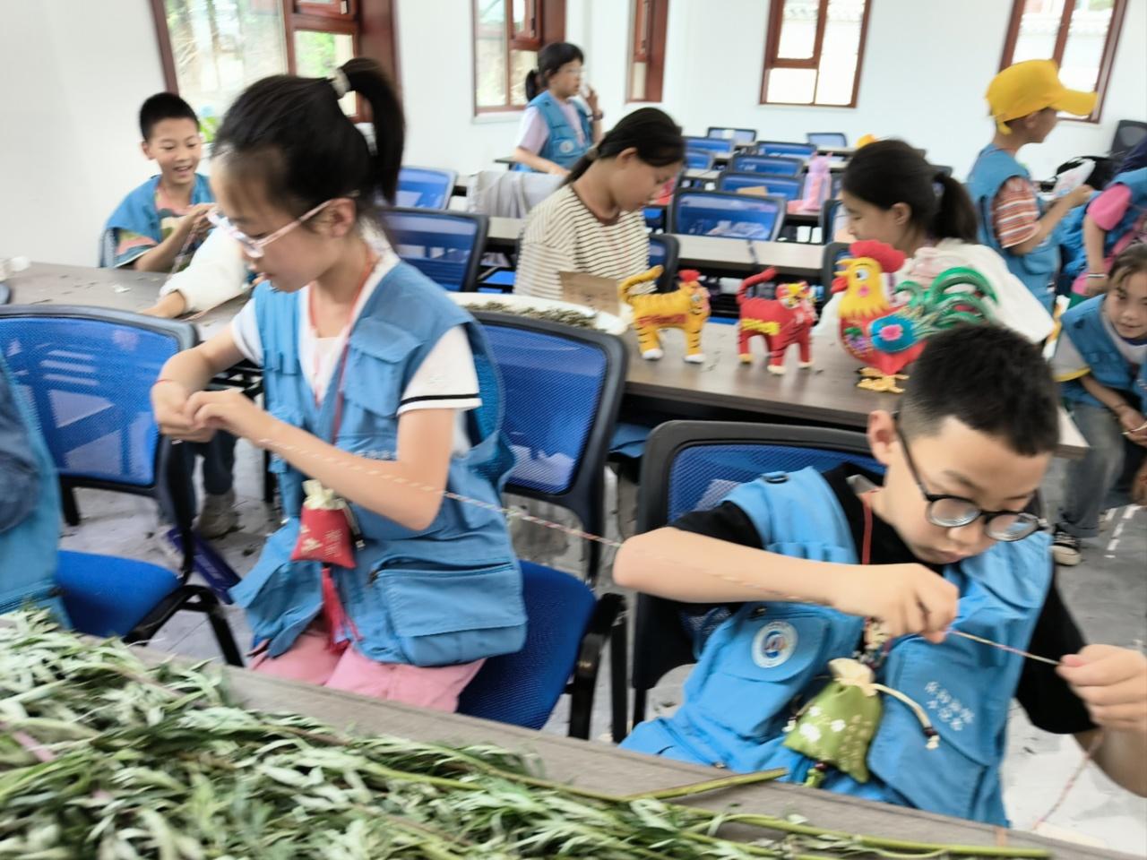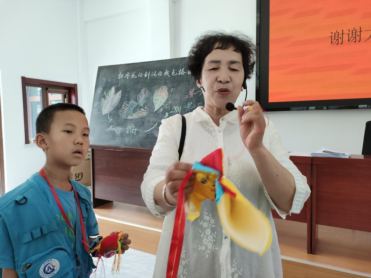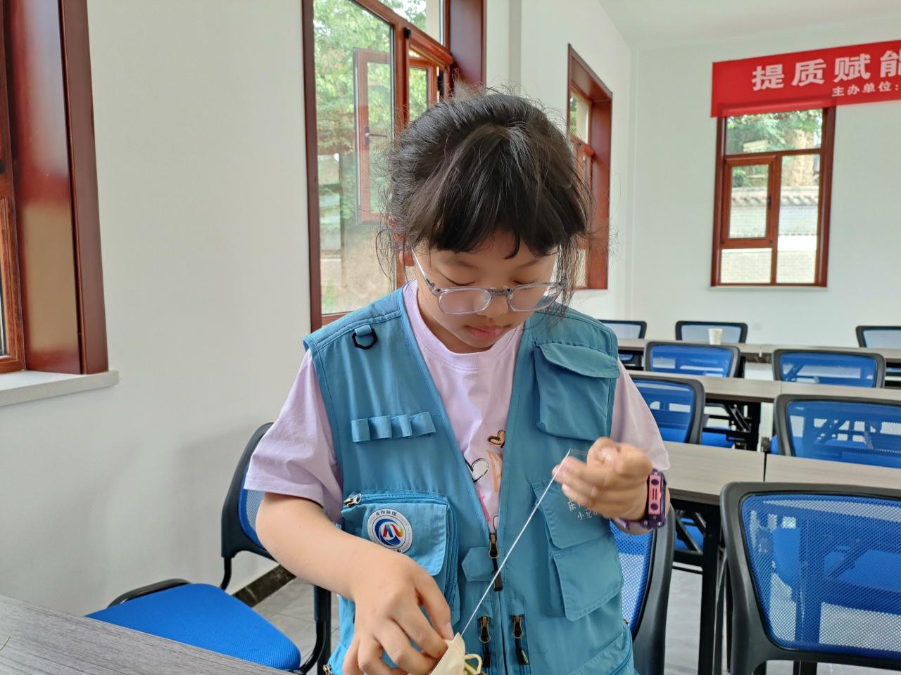 非遺體驗(yàn)環(huán)節(jié),看著桌上擺放的艾草、香囊、彩線、香料等,小記者們早已按捺不住激動的心情,紛紛加入制作香囊、花花繩的體驗(yàn)中。左煥茸奶奶給小記者們講解了佩戴香包的寓意及香包縫制的過程和針法。她一邊講解示范講解,一邊幫助小記者制作香囊和花花繩?!翱磥硐惆谱鬟€真不是件簡單的事?!薄袄蠋?,我要給花花繩上縫三個(gè)小南瓜?!薄白约褐谱鞯幕ɑɡK可真漂亮?!贝蠹s一個(gè)小時(shí),小記者們便完成了香囊和花花繩的制作。趙梓洋、趙怡軒、田易卓等小記者積極分享自己的體驗(yàn)收獲。
