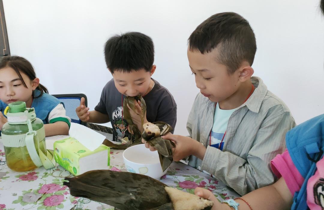 戴上了香囊和花花繩,節(jié)日的氛圍已經(jīng)拉滿。這時(shí),小記者們包好的粽子也出鍋了,左煥茸奶奶將提前準(zhǔn)備好的糖稀盛放在桌上??粗爸鵁釟?、飄著香味的粽子,小記者們早已垂涎欲滴。“這個(gè)粽子太好吃了,我還想吃一個(gè)?!薄皬膩頉]有吃過這么好吃的粽子?!逼穱L著自己包的粽子,小記者們心滿意足、意猶未盡。