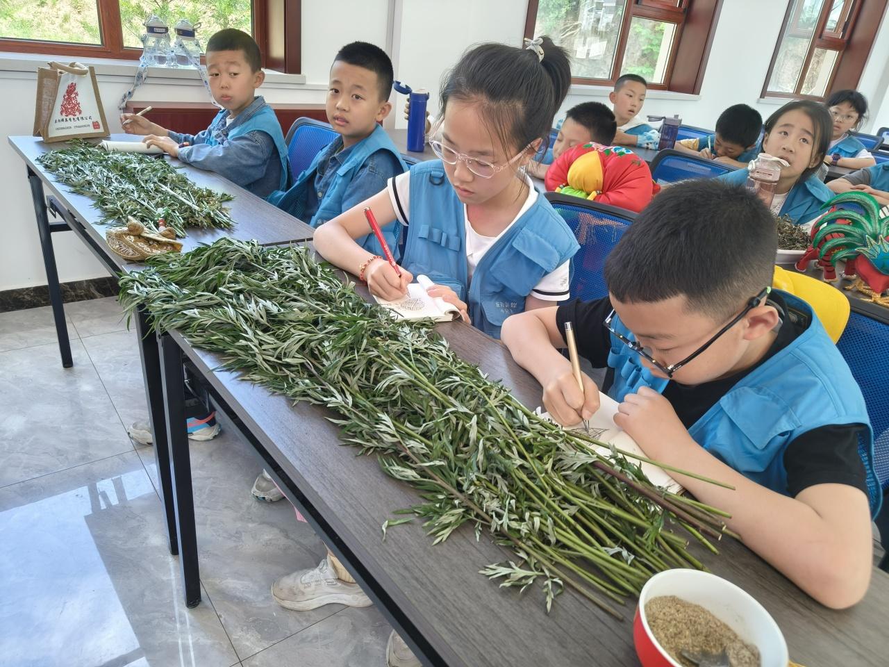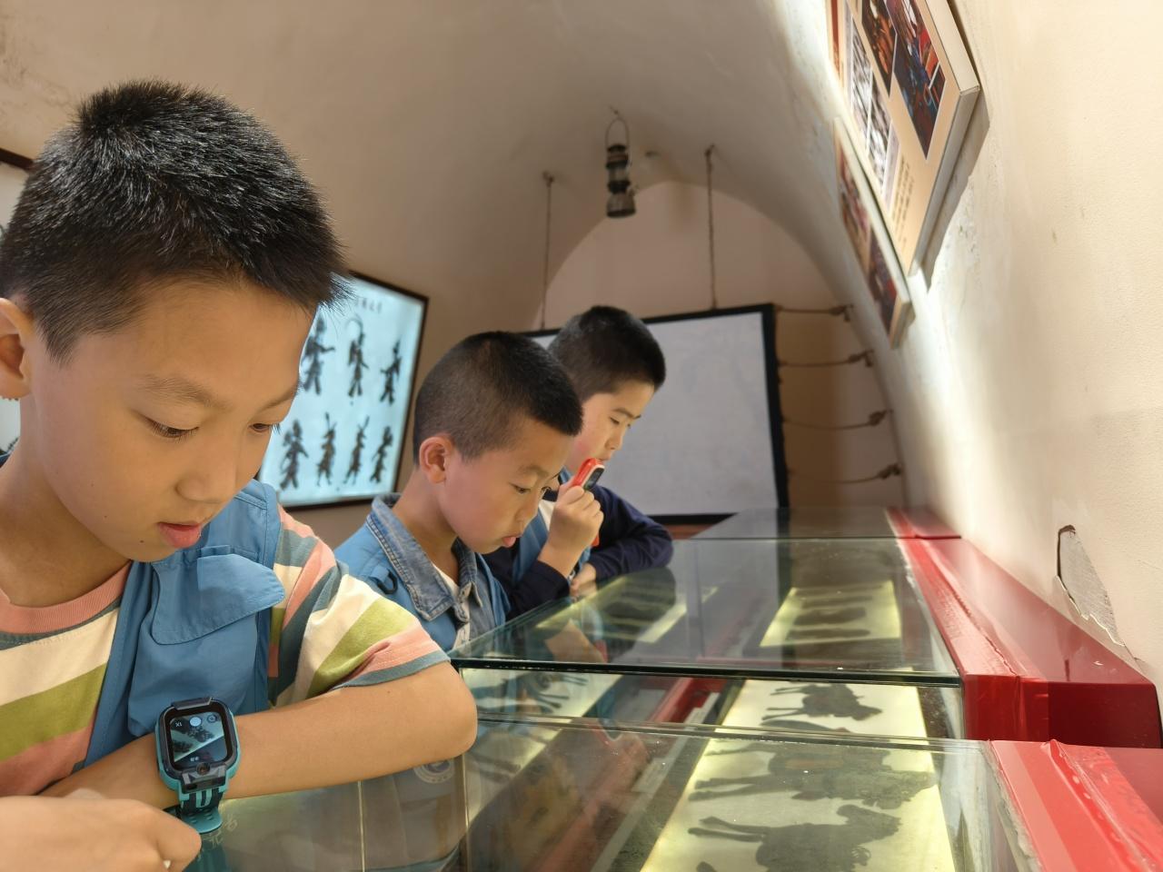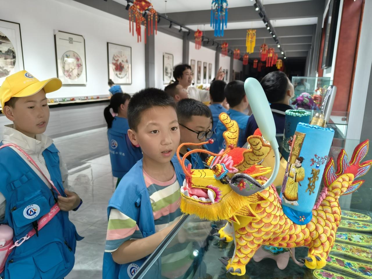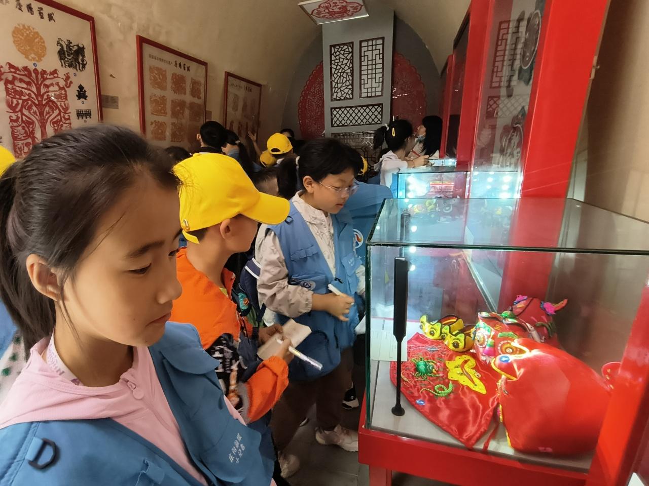 “這個(gè)展廳里面的沙盤呈現(xiàn)的是黃土塬的地形地貌,是世界上面積最大、土層最厚、保存最完整的黃土塬面?!薄拔抑?,我們生活在‘天下黃土第一塬’。”‘五毒’指的是什么?”“‘五毒’有蝎子、蜈蚣、毒蛇、蛤蟆、壁虎?!毙∮浾郀幭嗷卮鹬v解員提出的問題,認(rèn)真傾聽講解。通過參觀隴東民俗博物館、民俗禮儀、民藝精華、民間祭祀、隴上佛光、窯洞春秋五個(gè)部分的陳設(shè)展廳,小記者們對隴東地區(qū)極為豐富的文化資源和民俗文化,有了進(jìn)一步的認(rèn)識和理解,并了解了端午的起源、習(xí)俗,以及慶陽的民俗藝術(shù)“五絕”,有香包、剪紙、刺繡、皮影、隴東民歌。