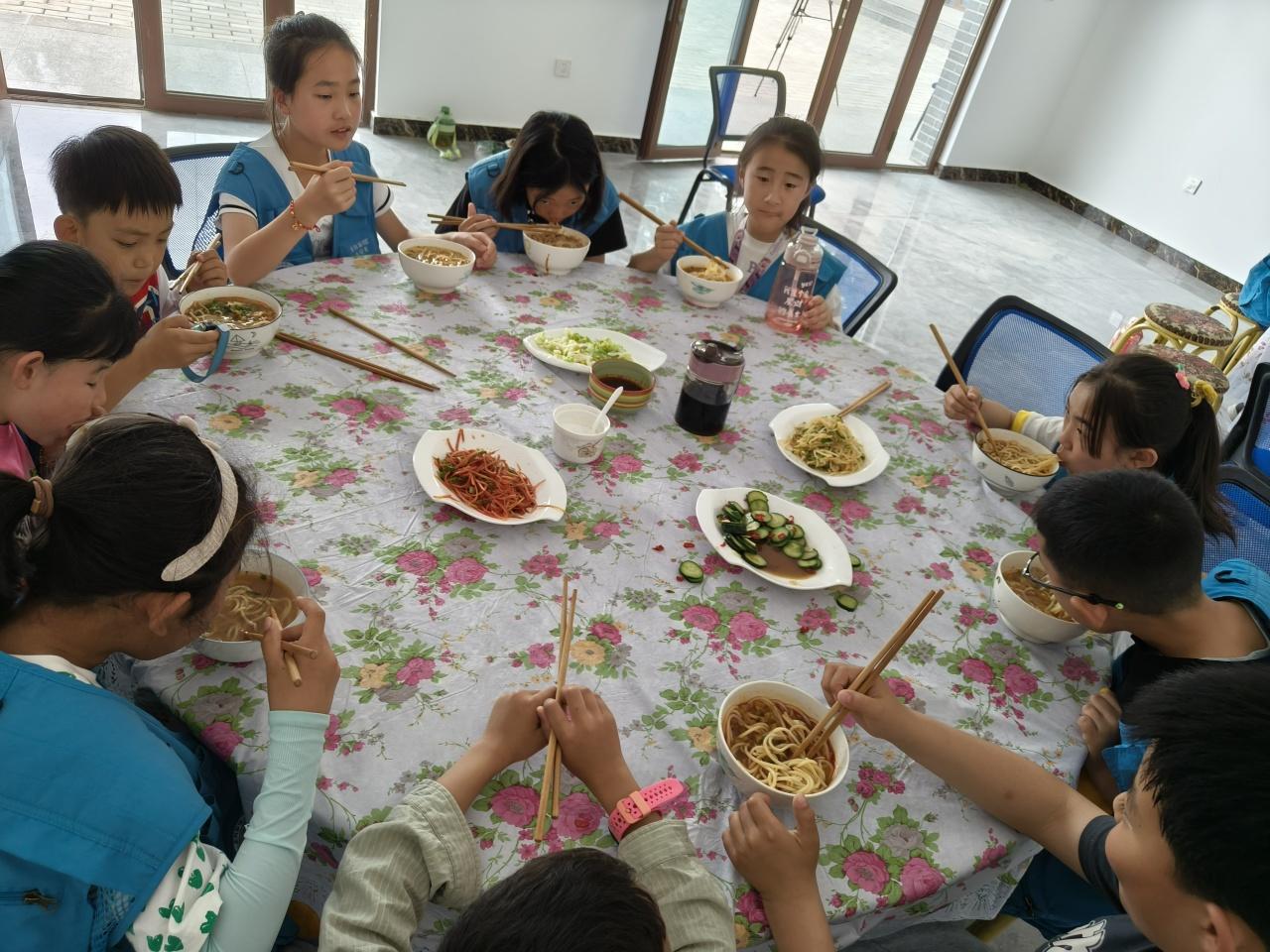 午飯時(shí)間,品味著左煥茸奶奶親手制作的農(nóng)家饸絡(luò)面,小記者們吃得格外滿足。“怎么這么好吃!我還要再吃一碗?!薄拔医裉斐粤巳搿!毙∮浾邆儗c陽美食饸絡(luò)面贊不絕口。