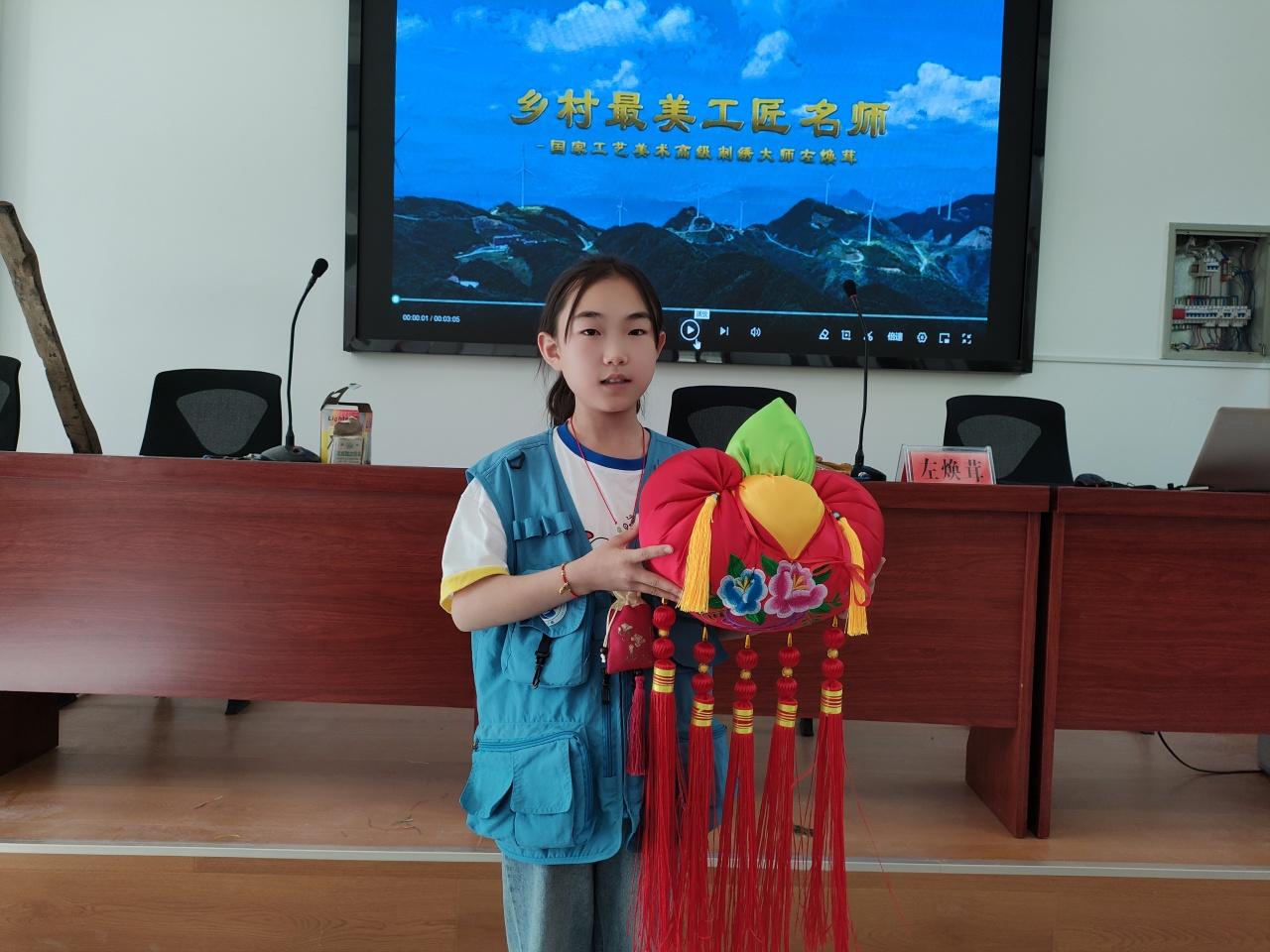 非遺課堂開講啦!“這個(gè)是張巧蓮,她在我們慶陽掀起了種蠶養(yǎng)桑的先河……這里就是我們香包基地的展廳?!痹谥袊耖g刺繡工藝大師、慶陽香包繡制省級非遺傳承人左煥茸的詳細(xì)講解中,小記者們觀看香包刺繡展品的同時(shí),驚嘆香包刺繡技藝的精湛?!斑@么長的刺繡作品是您一個(gè)人完成的嗎?”“這一件作品需要繡制多長時(shí)間?”“我從來沒有見過這么精美的刺繡作品!”小記者的問題不斷,贊不絕口。