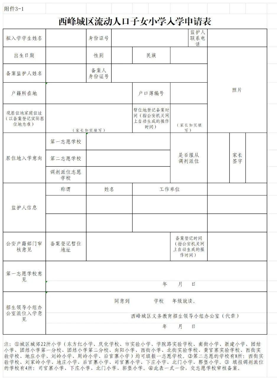 (二)非西峰戶(hù)籍流動(dòng)人口子女與西峰非城區(qū)戶(hù)籍流動(dòng)人口子女,提供監(jiān)護(hù)人及本人原籍戶(hù)口本、《西峰城區(qū)流動(dòng)人口子女小學(xué)入學(xué)申請(qǐng)表》。